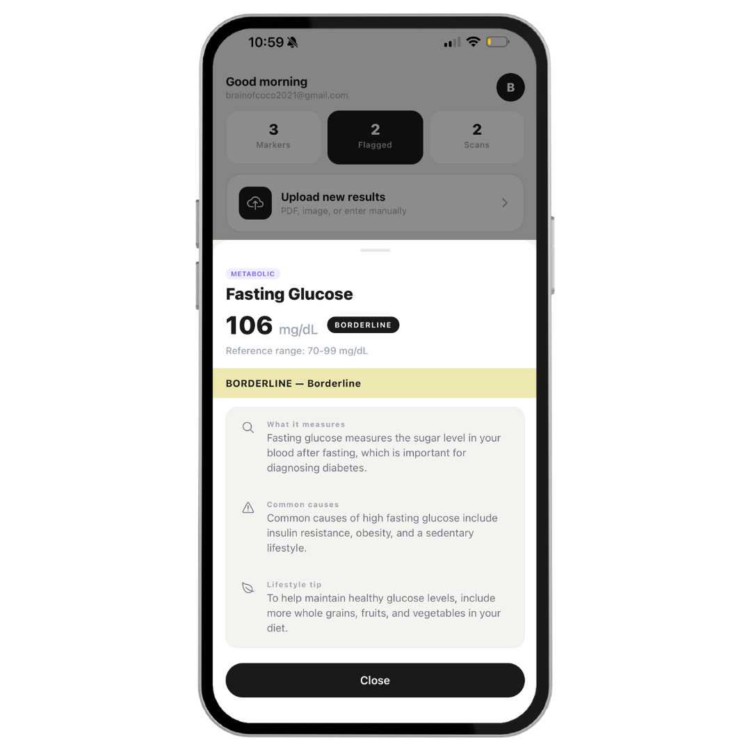 Confused by a specific result? Your personal AI health assistant explains what's normal, what's flagged, and what lifestyle changes can help — in plain English.