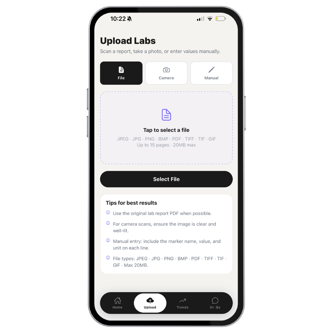Upload a PDF, snap a photo, or enter your values manually. LabbyQ's advanced AI extracts over 50+ biomarkers automatically and categorizes them.